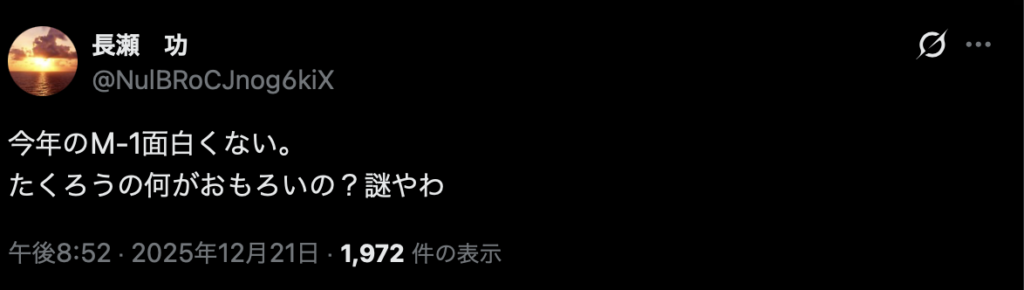 しかし、決勝戦の時点からSNSでは「たくろう面白くない」という意見が多くみられています。