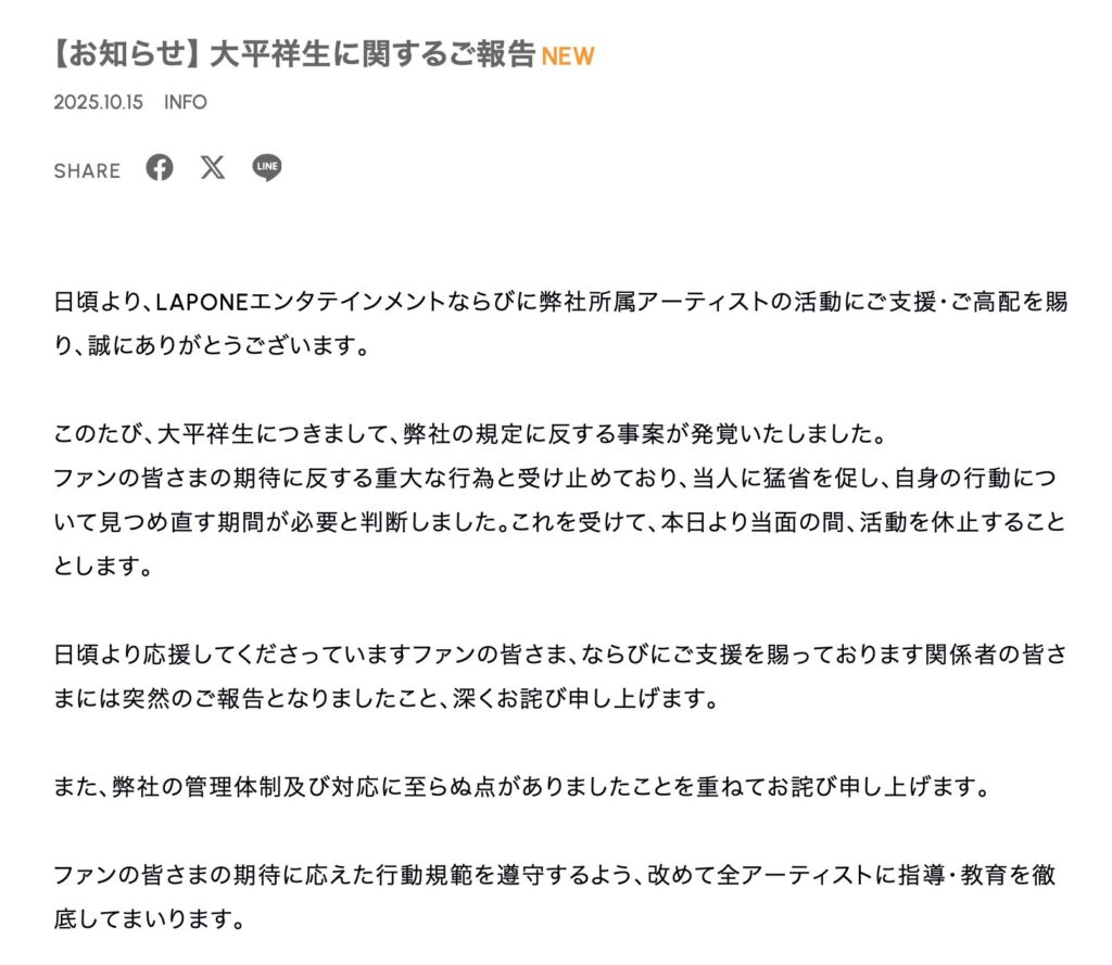 2025年10月15日に「JO1」の大平祥生さんが活動休止が決まり話題です。